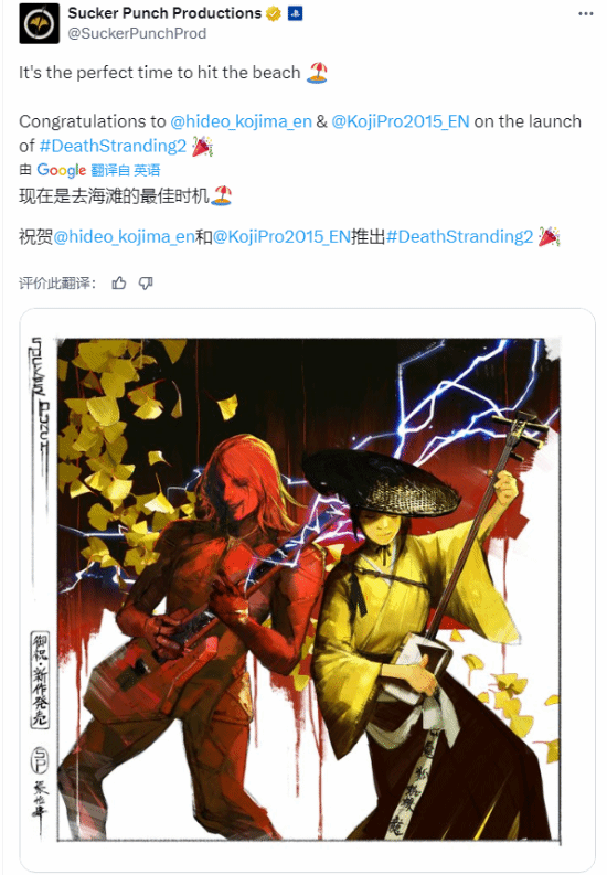 Sucker Punch Productions也带来了一幅酷炫插图,反派角色希格斯正与《羊蹄山之魂》的女主一同“合奏”。