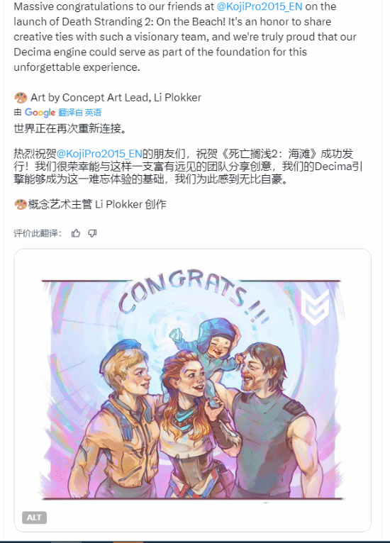 Guerrilla Games的插画也亮相,画中《地平线》的主角埃洛伊与《死亡搁浅2》的角色们亲切互动。值得一提的是,Guerrilla与小岛工作室关系密切,正是他们提供了Decima引擎,支撑起两代《死亡搁浅》的开发。
